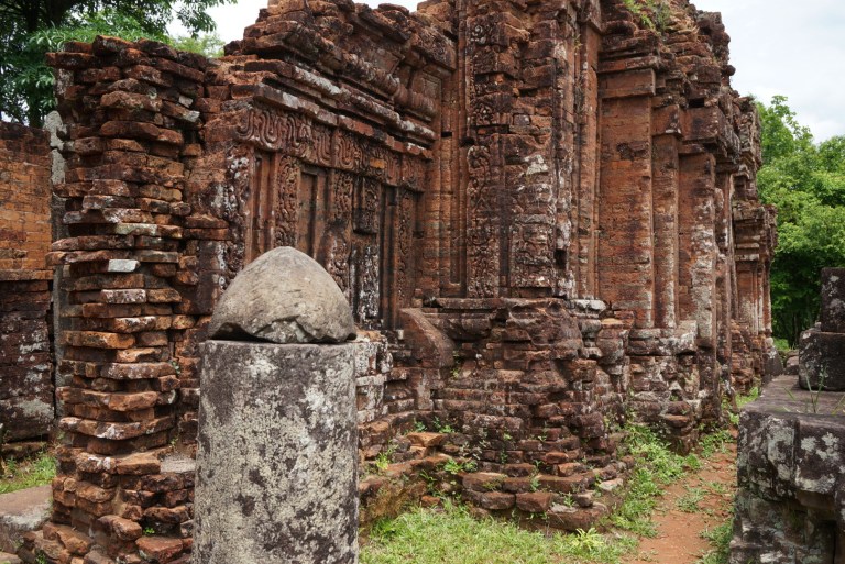 During our stay in Hoi An we went to visit old ruins of an sactuary called My Son (pronounced something like ‘mee son’). It was built for the god Shiva by a hinduist tribe called Champa. It was bombed heavily during the war so there isn’t so much left of it. We saw a lot of sink holes caused by bombs around, now already covered by grass. The area itself was beautiful, far away of the main roads and surrounded by dense jungle, in the foot of their holy mountain. It took us one hour with the bus from Hoi An to get to the area and then we went on to the sactuary with electric cars like from Jurassic park.