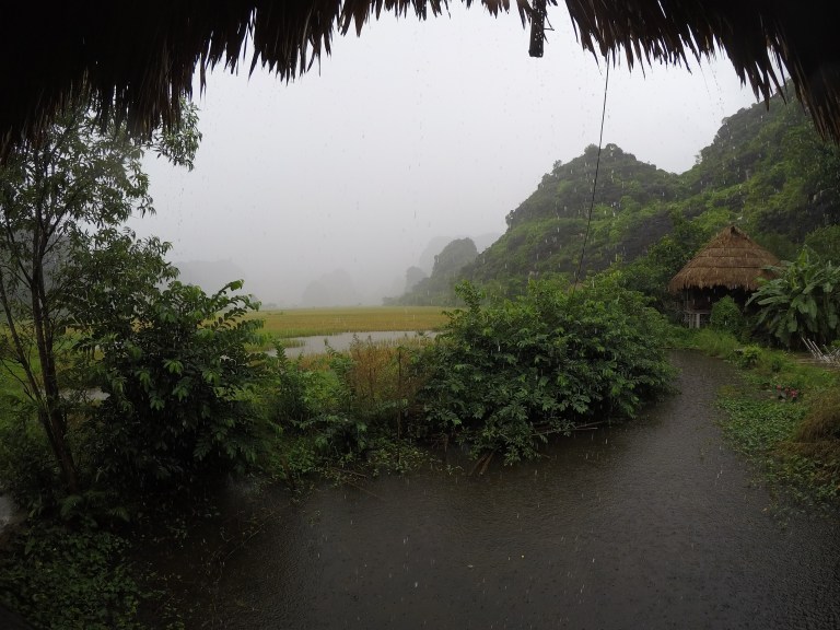 Our bus arrived on Tam Coc town at 4.30 AM, and it was still completely dark. Our homestay was not in the town itself, but six kilometres away. We decided to walk there as soon as there was some light. Our route lied accross the rice paddies, muddy trails and a little village. On the map it looked like there was no way to our homestay, which was showed in the middle of nowhere, and we almost lost our hope. But in the end, we found the place, it indeed was behind the hill in the middle of the fields.