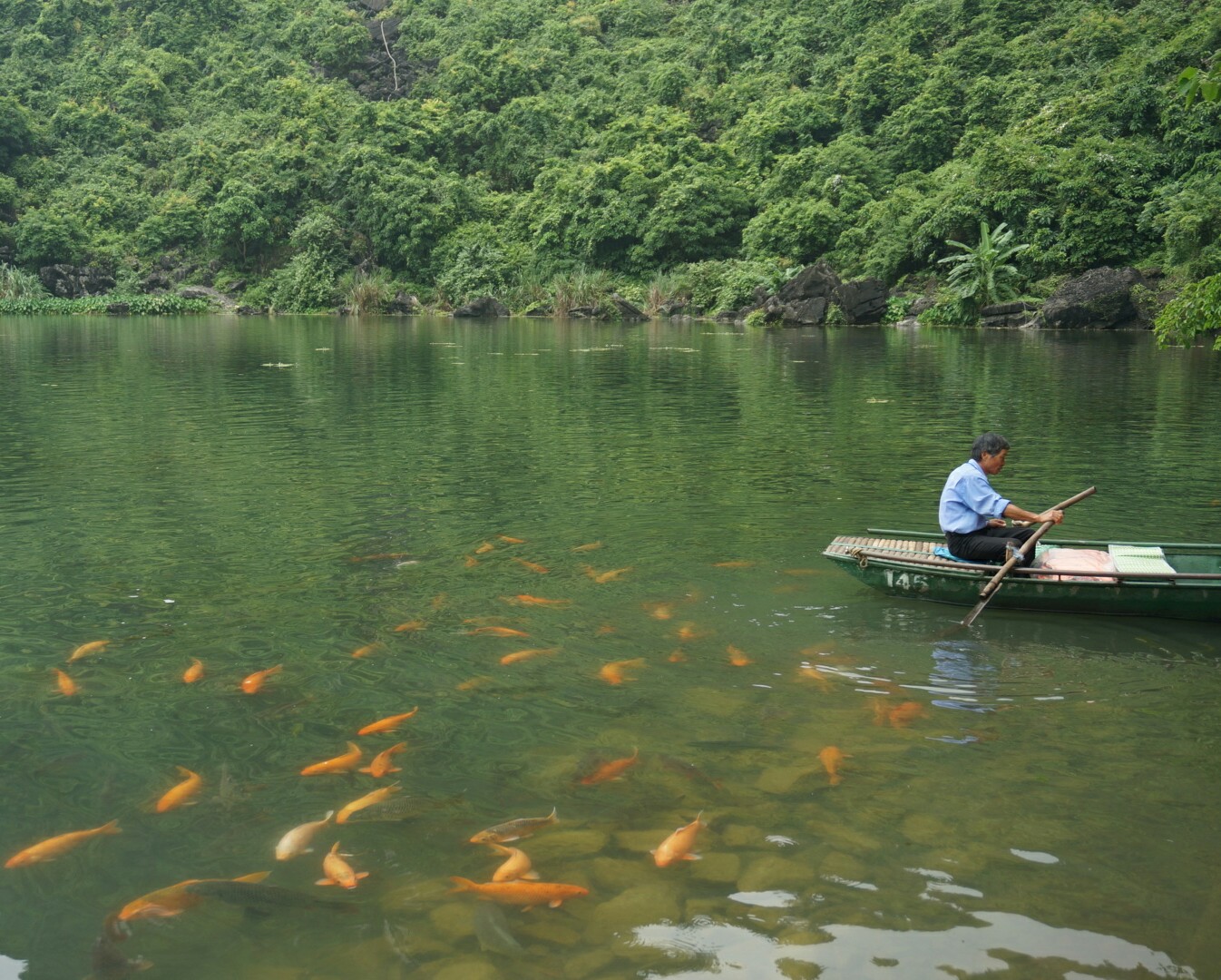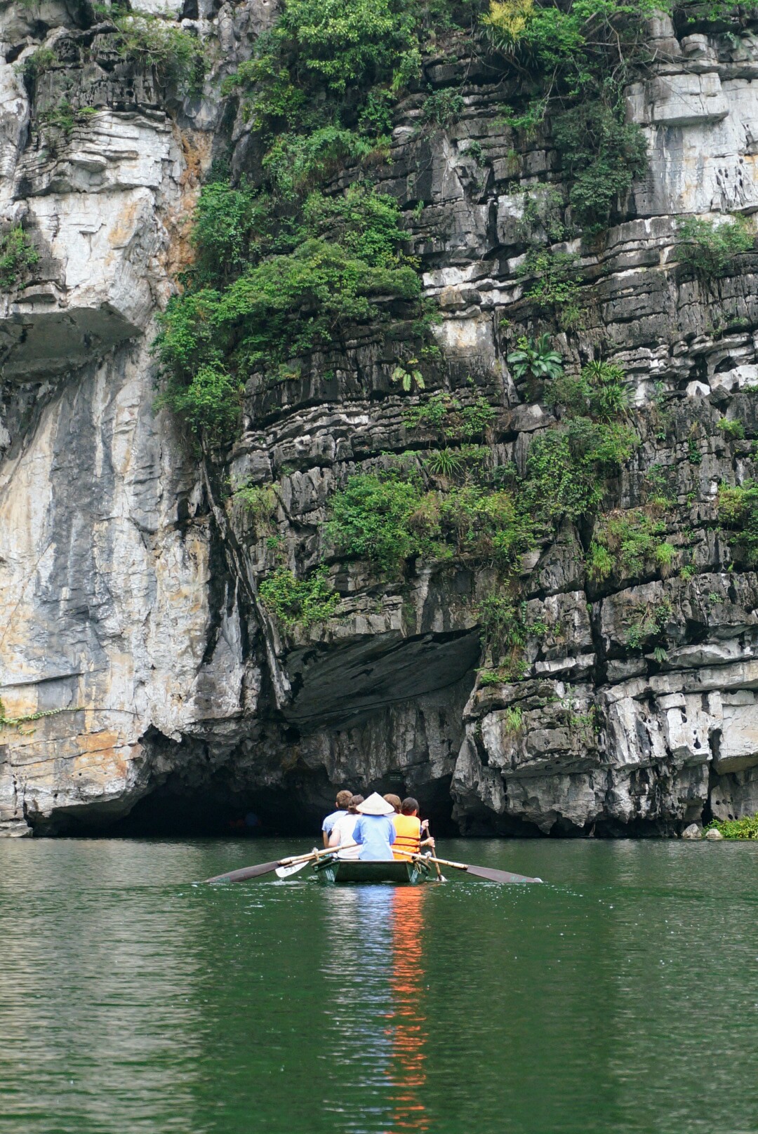 There we took a little boat with one British girl. Our rower was a small Vietnamese lady with strong arms and legs which she used rowing us for three hours around through grottoes and to different temples. The views were amazing and luckily there were not as many people as we feared. Most of the time it felt that we were just by ourselfs cruising along the river.