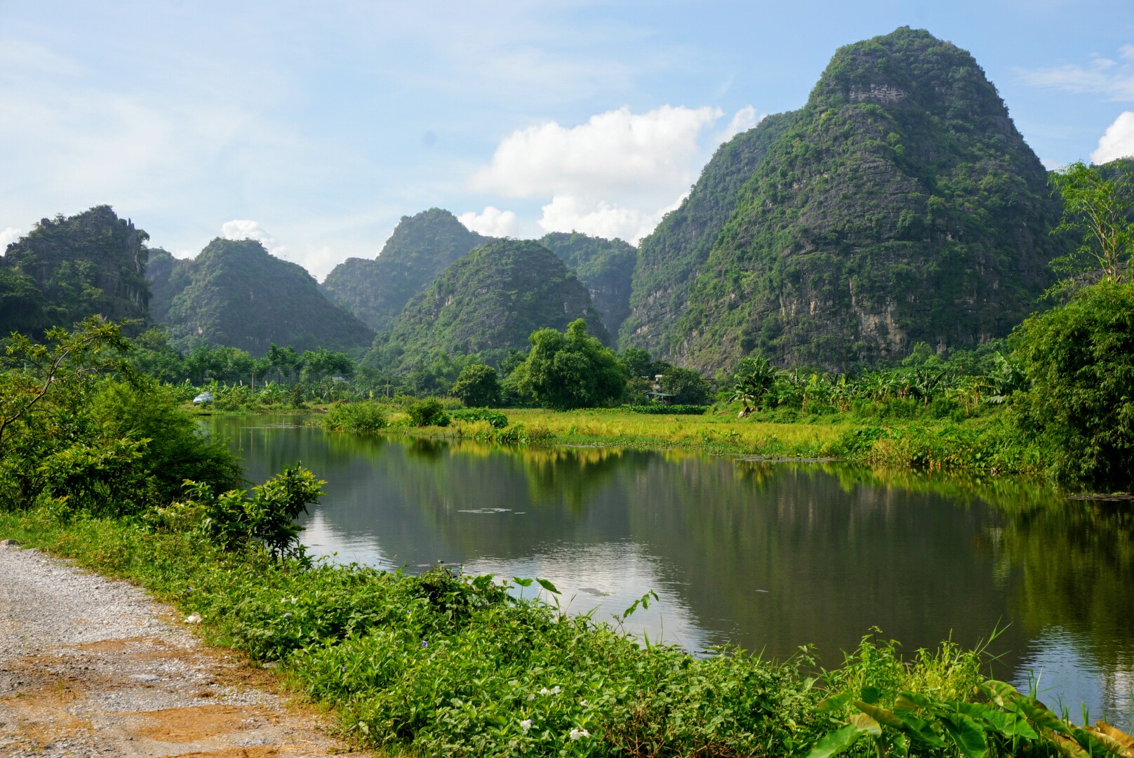 Our bus arrived on Tam Coc town at 4.30 AM, and it was still completely dark. Our homestay was not in the town itself, but six kilometres away. We decided to walk there as soon as there was some light. Our route lied accross the rice paddies, muddy trails and a little village. On the map it looked like there was no way to our homestay, which was showed in the middle of nowhere, and we almost lost our hope. But in the end, we found the place, it indeed was behind the hill in the middle of the fields.