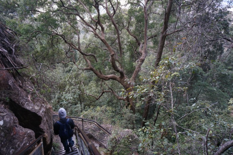 The really nice lady in the park info suggested us a good walking route that was mostly protected from the wind by the impressive cliffs. We took the Giant stairs down to the valley past the famous Three sisters. The name of the stairs is pretty accurate since they were pretty long and the views from them were extraordinarily beautiful and impressive. They were also really steep and sometimes hanging on the edge of the cliff, which made them pretty exciting.