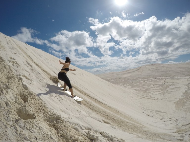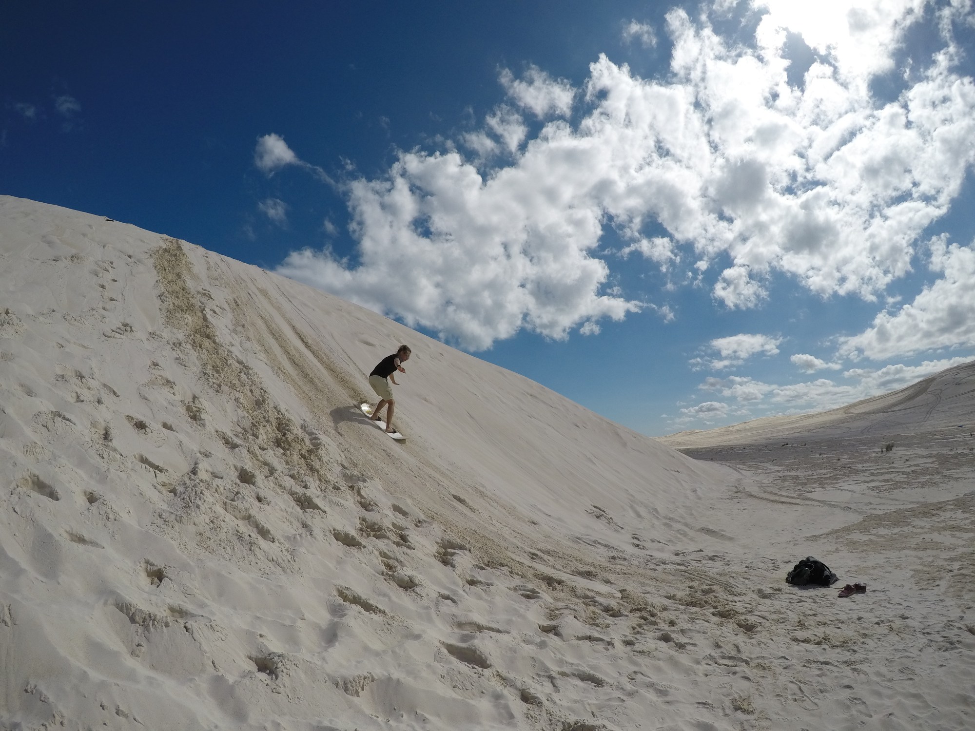 The next day we did what we came to do in Lancelin – sandboarding! We hired a sandboard (the board with wax and spray for two hours 15$, not so bad) and headed to sand dunes just behind the town. We were not alone, there was a bunch of people already sandboarding and other bunch riding motorcycles and buggies. Luckily there was plenty of space on the dunes and we found our own perfect spot. First trials were miserable failures – the board did not slide at all despite waxing. Then we realized that the slope has to be steep, steeper that you would like at first. Then it was great fun!
