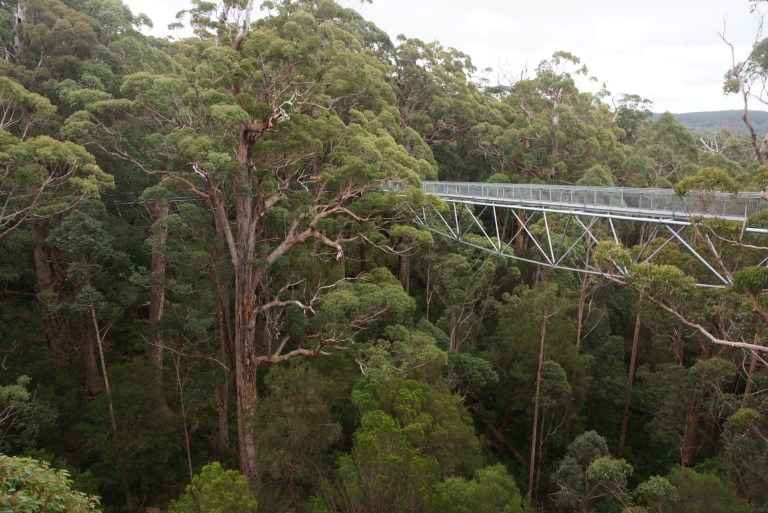 Valley of Giants refers to giant red tingles (a type of eucalyptus) that form an impressive forest. The main attraction there is the Treetop walk ($21/person), where it is possible to wander in the canopy on the same level with parrots and other birds. The highest point was 40 meters above ground level, and the views were really nice.