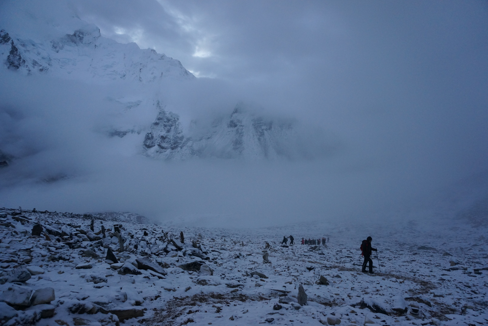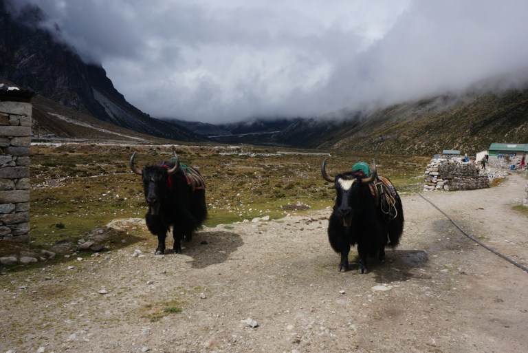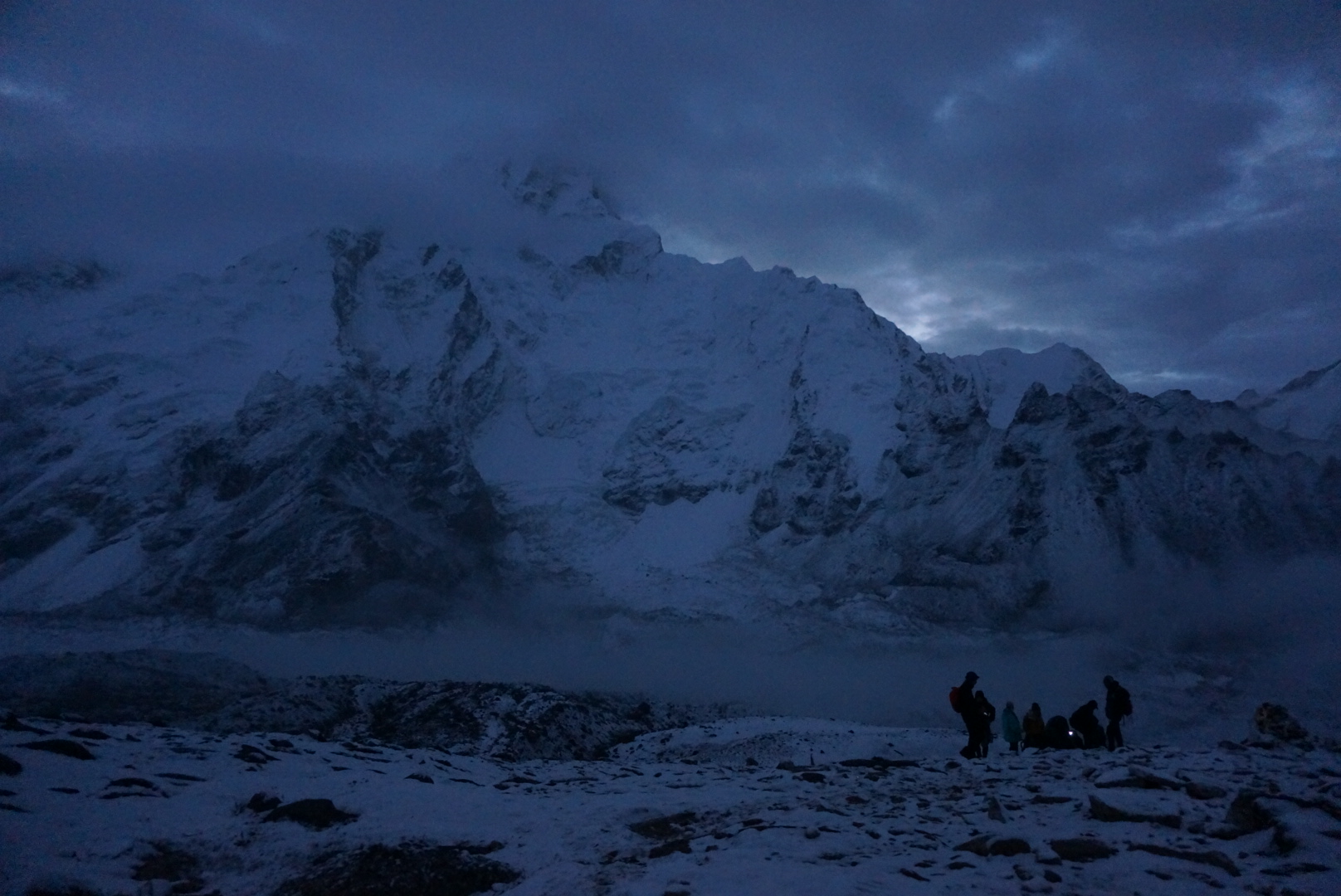The hardest day of our trek. We woke up at 3.30 in the morning, ate some chocolate, geared up with warm clothing and headlights and started to ascent to our highest peak, Kala Patthar ( black rock). It had snowed during the night. With the snow, darkness and the fact that our trail went 400m almost straight up made it feel a little bit like we were going to climb to Everest itself. Also a lot of people were doing the same route at the same time. Everybody wanted to be on top to see the sunrise and hoping to see Everest with a clear sky. We saw lots of lights going on top of us. At the beginning we had a lot of energy and we caught up and passed a bunch of people. But soon reality hit and our legs started to feel like concrete. Breathing in that altitude wasn’t the main problem, although it must have had its effect since the trail was really hard on the legs. It took us two hours to reach the top. We were pretty tired. Gladly Raj came to the resque and gave us chocolate cookies for energy.
