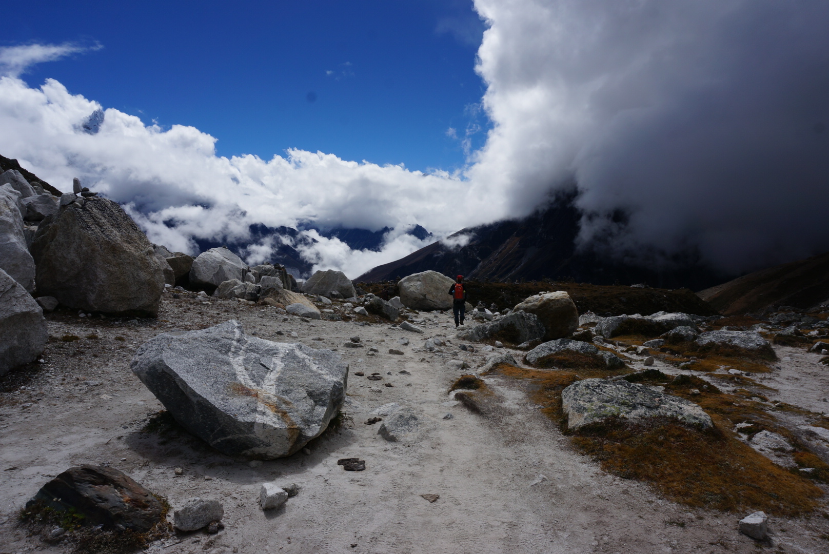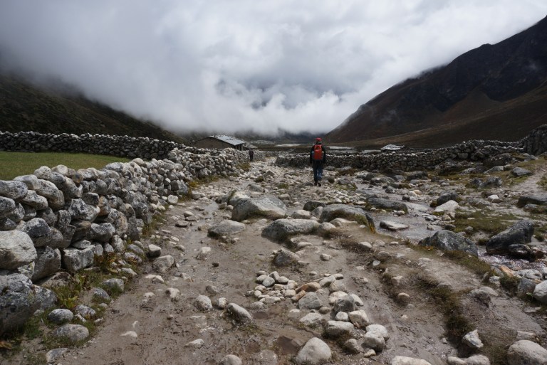 At our lodge we had quick breakfast and started our journey back where we came from. Our destination was a village Pangbuche at the altitude of 3930m. At the beginning of our trek the plan was that after Kala Patthar we would go to Gokyo. Going there meant spending three more days in altitudes between 4500m and 5400m. But stomach problems, tiredness from altitude and cloudy weather made us change the plan and we decided to skip Gokyo. Later we saw that indeed it would not have been even possible to go there at least that day. The way to Gokyo goes through high Chola pass that was closed because of bad weather and snowfall. On the way down we saw a group coming back from Chola pass because they could not get through.