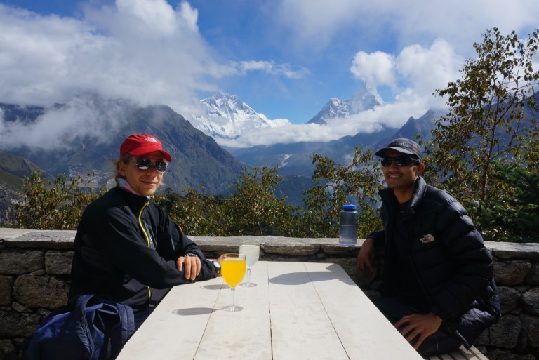 For the acclimatization it is usual to walk up and get back to sleep low. For that our porter had a rest day, and in the morning we just took some water and wind jackets with us and started to walk straight up. Starting with what felt like thousands of stairs. At the beginning heartrate went up and we were both out of breath, but luckily it got easier pretty fast (though still not easy). There was a small military base beside Namche and apparently the soldiers run this route every morning (as do school kids that live near Namche). Our route went pass a little farm house and a helicopter landing site. Almost all the way we were accompanied by a street dog running by on our side. We ascented a total of 400m in two and half hours to Everest view hotel to have a tea. Unfortunately, Everest was hiding behind the clouds but we got a good view of two other mountains, Lhotse and Ama Dablam.