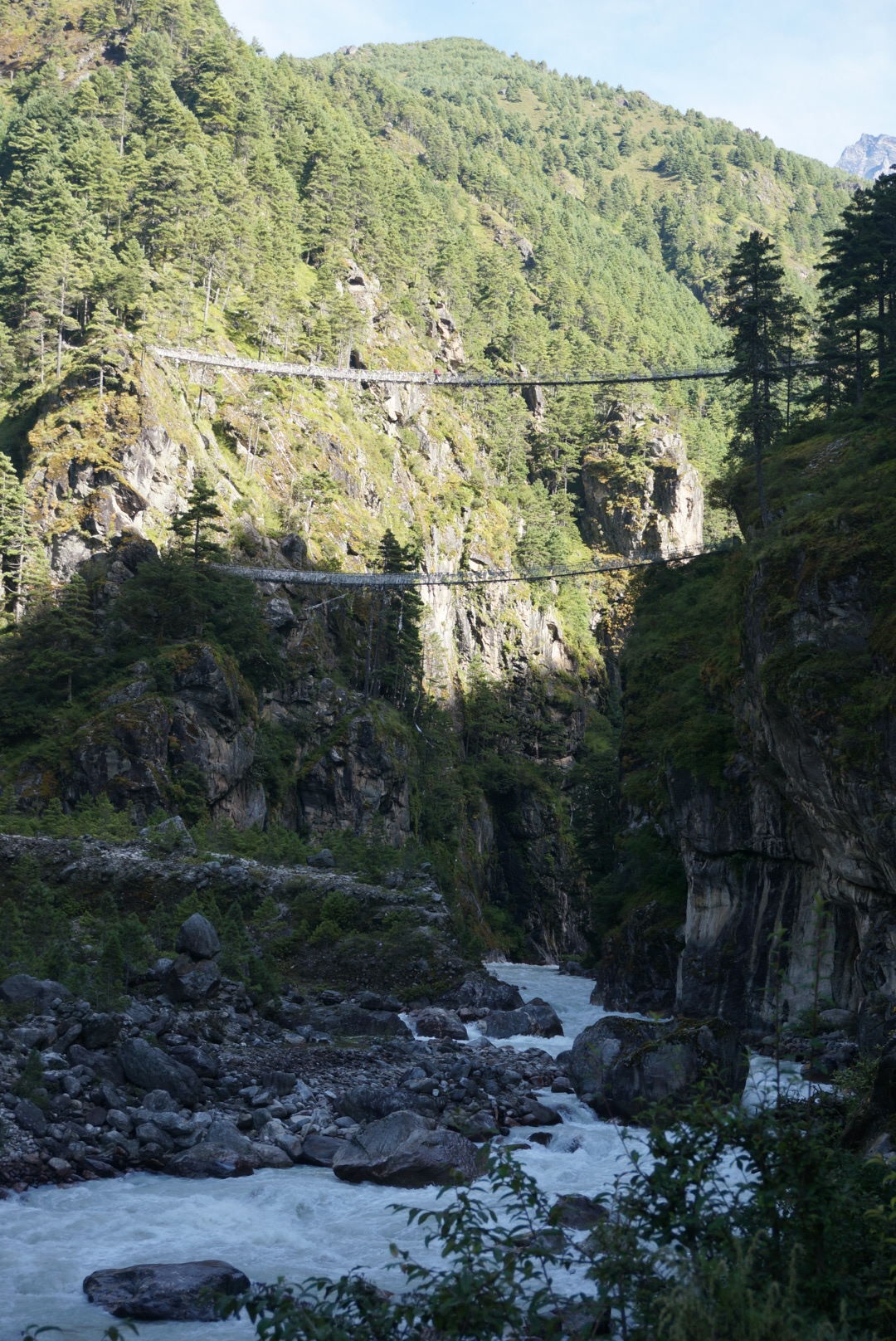 We woke up at 5.55 am, had some Tibetan bread for breakfast and started walking to Namche Bazar ( 6 km, 2,5 h ). First, we started to go a bit downhill and descented to a river valley where we walked beside the river that flows down all the way from Tibet. We stopped to admire a big suspension bridge that hung above us and to rest for a while beacause from there, it was only uphill. ( The bridge was also used in a scene in the movie ”Everest” ).