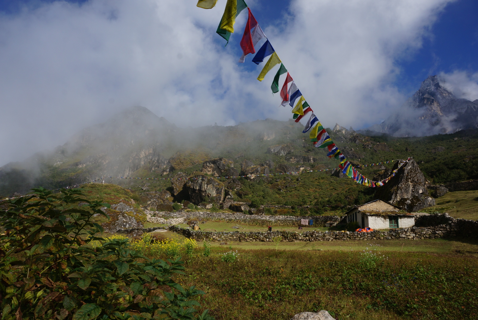 For the acclimatization it is usual to walk up and get back to sleep low. For that our porter had a rest day, and in the morning we just took some water and wind jackets with us and started to walk straight up. Starting with what felt like thousands of stairs. At the beginning heartrate went up and we were both out of breath, but luckily it got easier pretty fast (though still not easy). There was a small military base beside Namche and apparently the soldiers run this route every morning (as do school kids that live near Namche). Our route went pass a little farm house and a helicopter landing site. Almost all the way we were accompanied by a street dog running by on our side. We ascented a total of 400m in two and half hours to Everest view hotel to have a tea. Unfortunately, Everest was hiding behind the clouds but we got a good view of two other mountains, Lhotse and Ama Dablam.