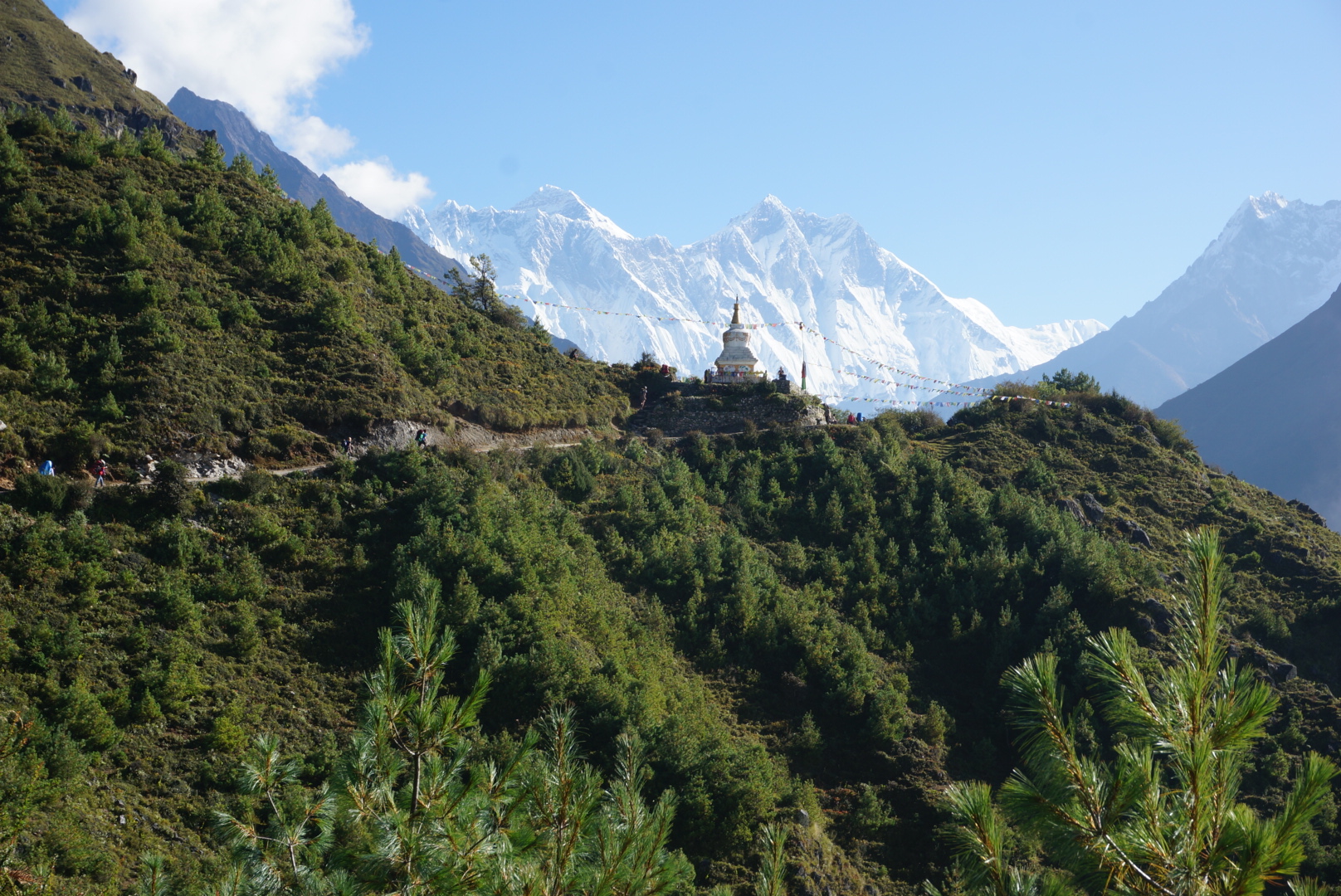 We woke up again at 5.55 am. Above Namche everything would get more expensive so before breakfast Ville went to local supermarket to stock up, mostly toiletpaper. After eating we started walking towards Tengbuche. First part of the trail was easy, flat road following a mountain gorge. Down from us was a river valley and on the other side a lush forest. Along the way a we passed a couple of stupas that were also Everest lookouts. At the first stupa we saw Everest again.