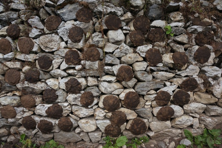 In the morning Valeria was again feeling not so good, but we decided still to go to our next destination. At first, we were walking a little bit down to a river, but after that mildly up the whole way. On the way we saw small Sherpa villages and couldn’t help noticing that they had yak outdroppings drying everywhere.
