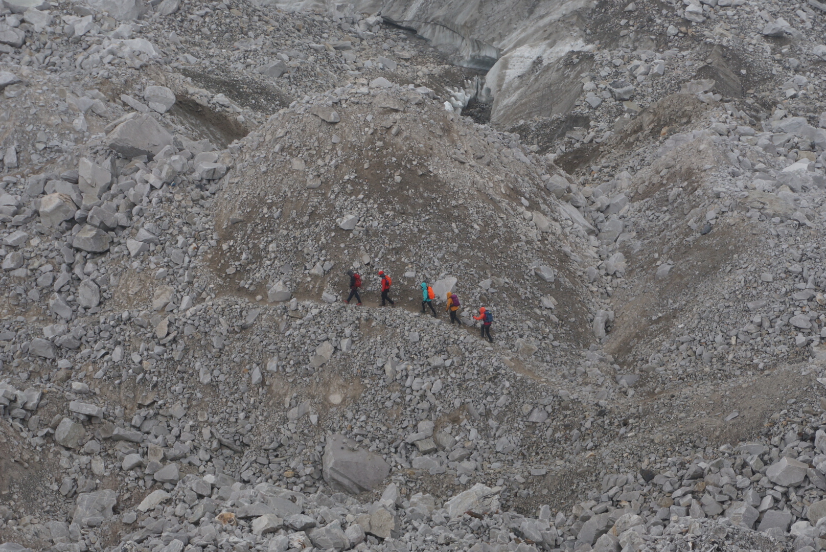 But after lunch we headed towards Everest Base Camp. It started to snow while we were walking. We heard and saw land slides and avalanches, reminding of the dangers in the high mountains. Actually, the old Everest Base Camp was destroyed in an avalanche caused by the earth quake in 2015. The new one is at the bottom of Khumbu glacier that has taken many lives, including 16 Sherpas in 2014.