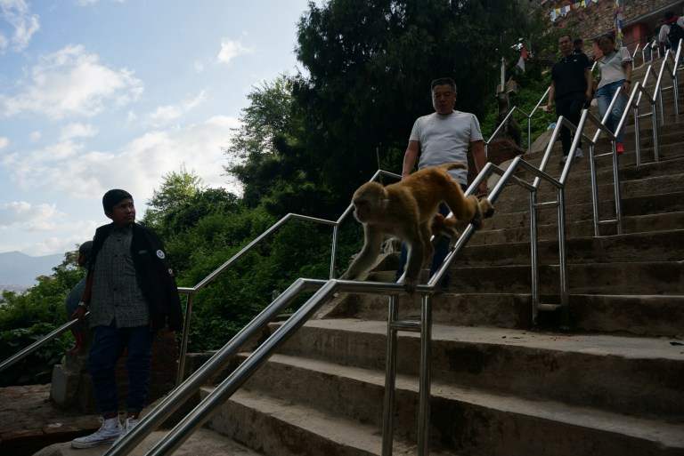 We did a little walk to Swayambhunath stupa, also widely known as the monkey temple. And yes, the name comes probably from the huge number of monkeys that reside there. The temple is way up on the hill and there’s a long and exhausting stairway leading there. The monkeys don’t always bother walking down so they’ve mastered the art of sliding the rails giving thrills to tourists.