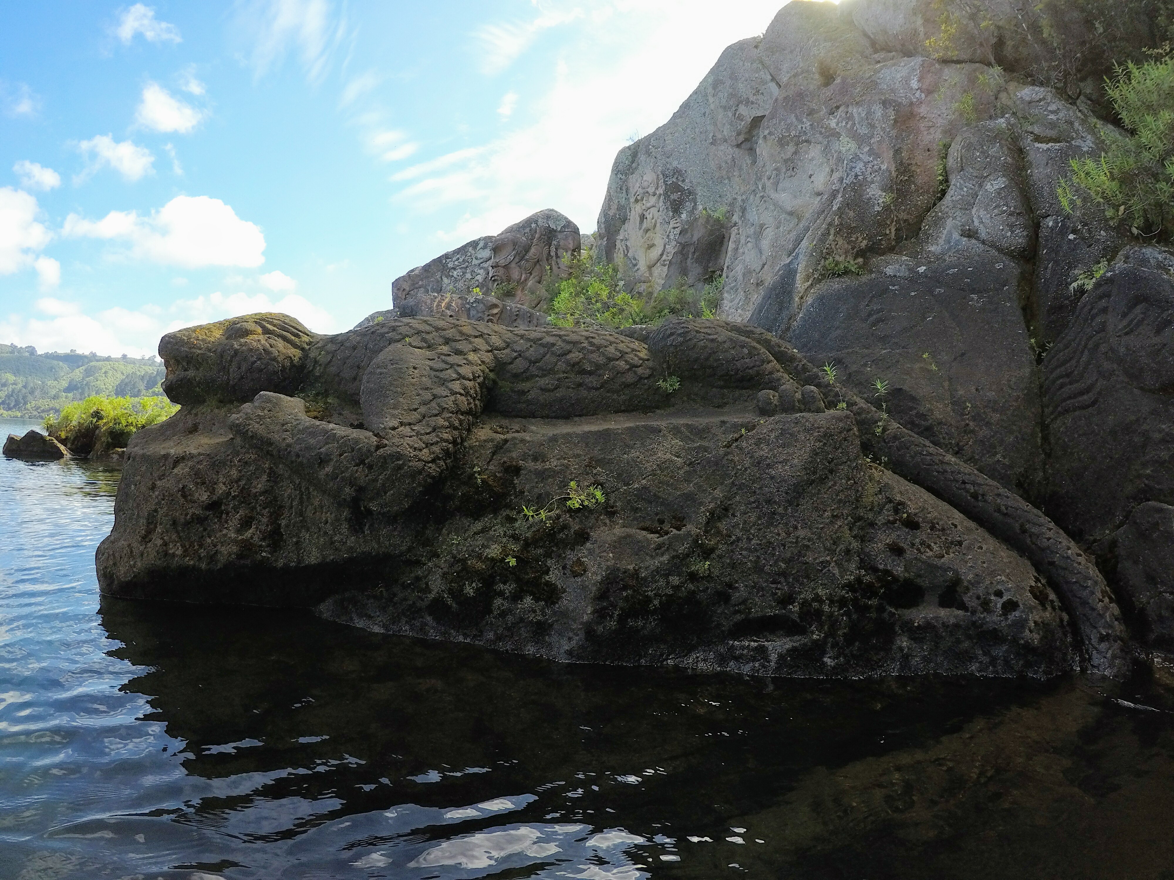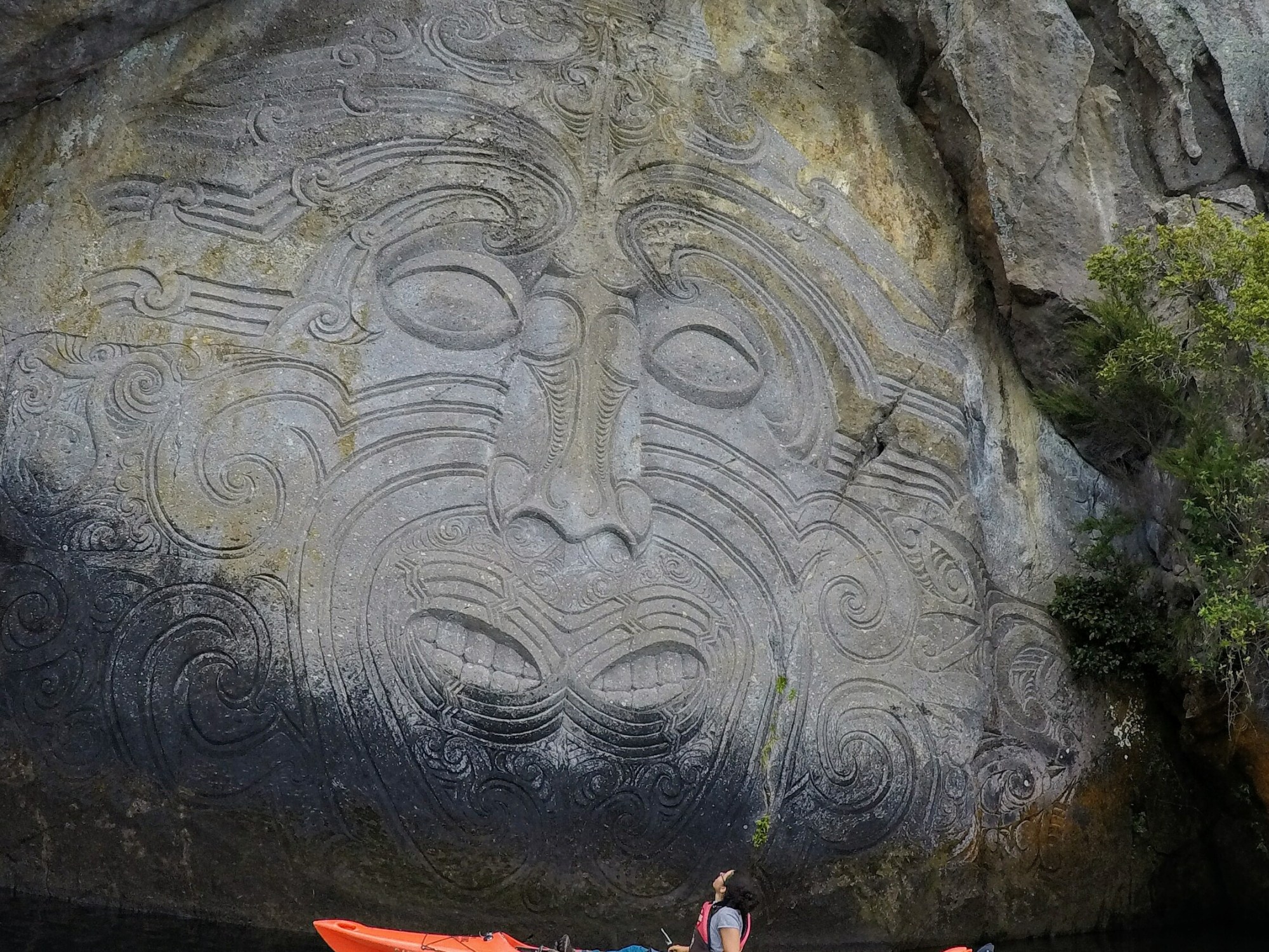 Next morning the sun was shining and it was going to be a warm day. We drove a bit outside of the city center to Acacia Bay to rent kayaks. We were just in time because the owner of the shop was about to leave. So we took the kayaks for half a day ( 40$ per kayak). Our plan was to paddle to see Maori rock carvings in a rock wall beside the lake. It was about 1,5 hour paddle from Acacia Bay to the spot. The day was really nice. In the beginning the wind made it a bit hard to paddle but it soon calmed down. The rock carvings were impressive. There was this huge carving of a face representing the first Maori in Taupo Area and next to it a statue of an lizard. The best thing was that we were the only ones there. We could just relax and flout with our kayaks and admire the carvings. When we were leaving a few other boats started to appear at the same place.