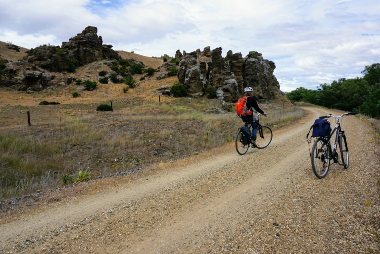 From Queenstown we first drove to Cromwell to a holiday park to set up our tent. Then we headed to Alexandra to rent bikes for the day. We wanted to bike a part of the Central Otago rail trail. The trail goes along an old railway track covering in total 152km from Clyde to Rock and Pillar. Our plan was to ride 37km to Omakau and then back to Alexandra. But soon we realized that was not going to happen. It was a bit windy when we started biking from Alexandra but we thought it would not be a problem. When we got to an open field the wind hit us really hard. The head wind was so strong that we could barely move forward even at pedestrian speed. After biking 15 km we were totally beaten. So we decided to stop at Chatto Creek to have lunch and head back.